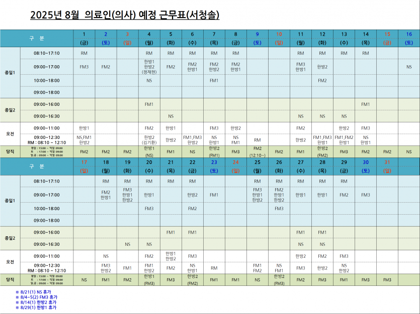 【 2025년 8월 서청솔 의사 근무표 공지 】 페이지 정보 작성자 관리자 작성일25-07-29 15:56 이전글 다음글 목록 본문 【 2025년 8월 서청솔 의사 근무표 공지 】 이전글 다음글 목록