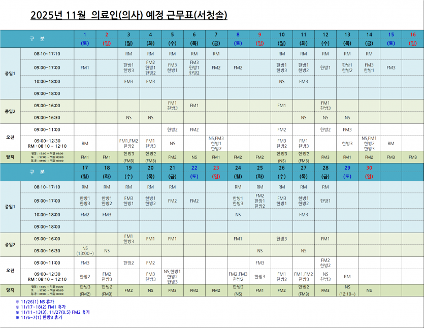 【 2025년 11월 서청솔 의사 근무표 공지 】 페이지 정보 작성자 관리자 작성일25-10-28 15:23 다음글 목록 본문 【 2025년 11월 서청솔 의사 근무표 공지 】 다음글 목록