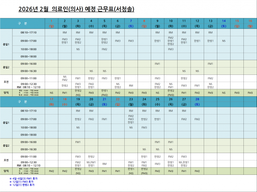 【 2026년 2월 서청솔 의사 근무표 공지 】 페이지 정보 작성자 관리자 작성일26-01-28 10:14 이전글 다음글 목록 본문 【 2026년 2월 서청솔 의사 근무표 공지 】 이전글 다음글 목록