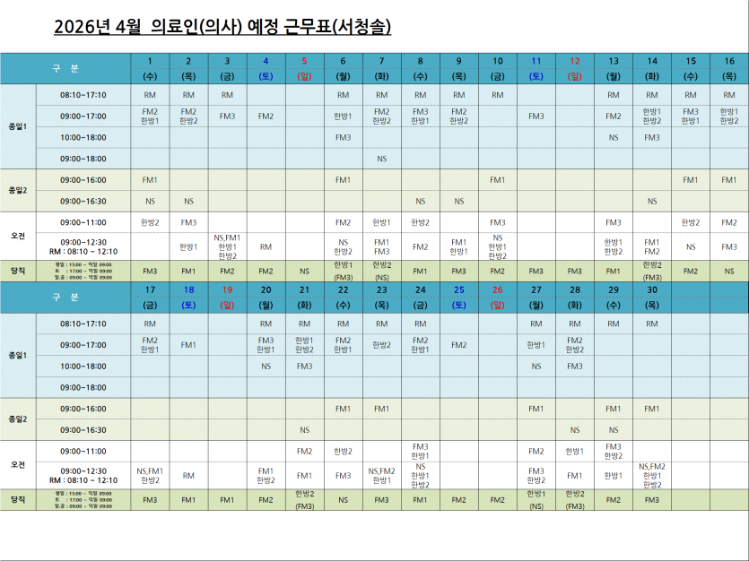 【 2026년 4월 서청솔 의사 근무표 공지 】 페이지 정보 작성자 관리자 작성일26-03-26 10:23 다음글 목록 본문 【 2026년 4월 서청솔 의사 근무표 공지 】 다음글 목록